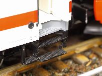 ![]() Vnitřní kolejnice v oblouku R1 je půdorysně na samé hraně bočnice vozové skříně. | ![]() Spřáhlo vysunuje konstrukci nástupních schůdků do boku. | ![]() |