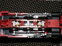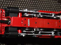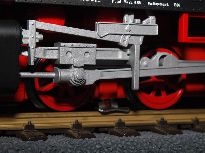 Podstatně hůř vzhledově působí pojezd. Hvězdicová kola jsou jsou zjednodušená a tyčoví parního stroje je opravdu velmi hračkovité, šoupátkové rozvody jsou nekompletní a nepohyblivé. Model má hnané dvě krajní nápravy, střední náprava je hnaná jen spojnicemi. Šnekový převod motoru je stejně jako u předchozích modelů proveden tak, že koly modelu nelze naprázdno otáčet. To je principiálně nevýhodné, zejména při údržbě (čistění) kol. Zvyšuje to také opotřebení převodů v případě náhlého zastavení vlaku. Kola jsou ze stejné černěné slitiny se stejnými vlastnostmi, jako u předchozích modelů lokomotiv.