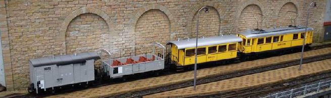 Modelová souprava ztvárňuje motorový vůz BCe 1, spolu s pětiokenným dvounápravovým vlečným vozem C 111, dvounápravovým otevřeným panoramatickým vozem L 352 a zavřeným nákladním vozem K 201. Jde tedy o smíšený vlak ze začátku provozu.