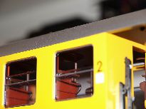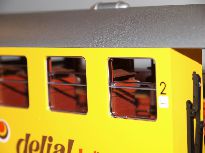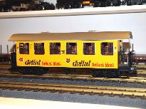 Německý osobní čtyřnápravový vůz DB Wangerooge řady KB4i č. Han 104 s celovozovou reklamou »delial« se žlutým podkladem patrně také modeláře nepřesvědčil. Snížená cena je však zajímavá. Žlutá barva vozu není zas nějak extra ukřičená a konec konců – celovozové reklamy k současnosti patří, tak co. Pozorní si všimnou, že v tomto případě jde o variantu šestiokenného vozu s mnoha funkčními detaily – model má individuálně spouštěcí všechna okna, nástupní plošiny se sklopným zábradlím a sklápěcím přechodovým plechem a otvírací přechodovou brankou, posuvné vstupní dveře, propracovaný interiér se sedačkami a dvoupatrovými zavazadlovými policemi. Co se týká uvedených funkčních pohyblivých součástí – jde o nejpropracovanější osobní vozy v sortimentu LGB vůbec. Takže – i kdyby měl být vůz přestříkán, stojí za to.